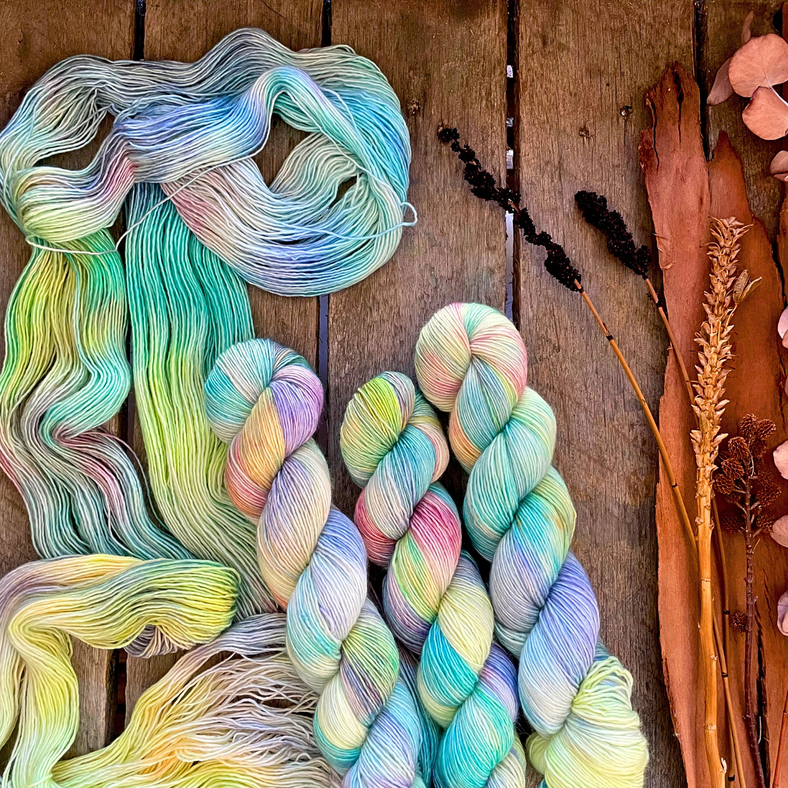A single-ply fingering yarn, hand-dyed in Cape Town. Wind it into a ball and knit into socks, shawls, or a sweater that carries the variegated story you see. No two skeins are ever the same.