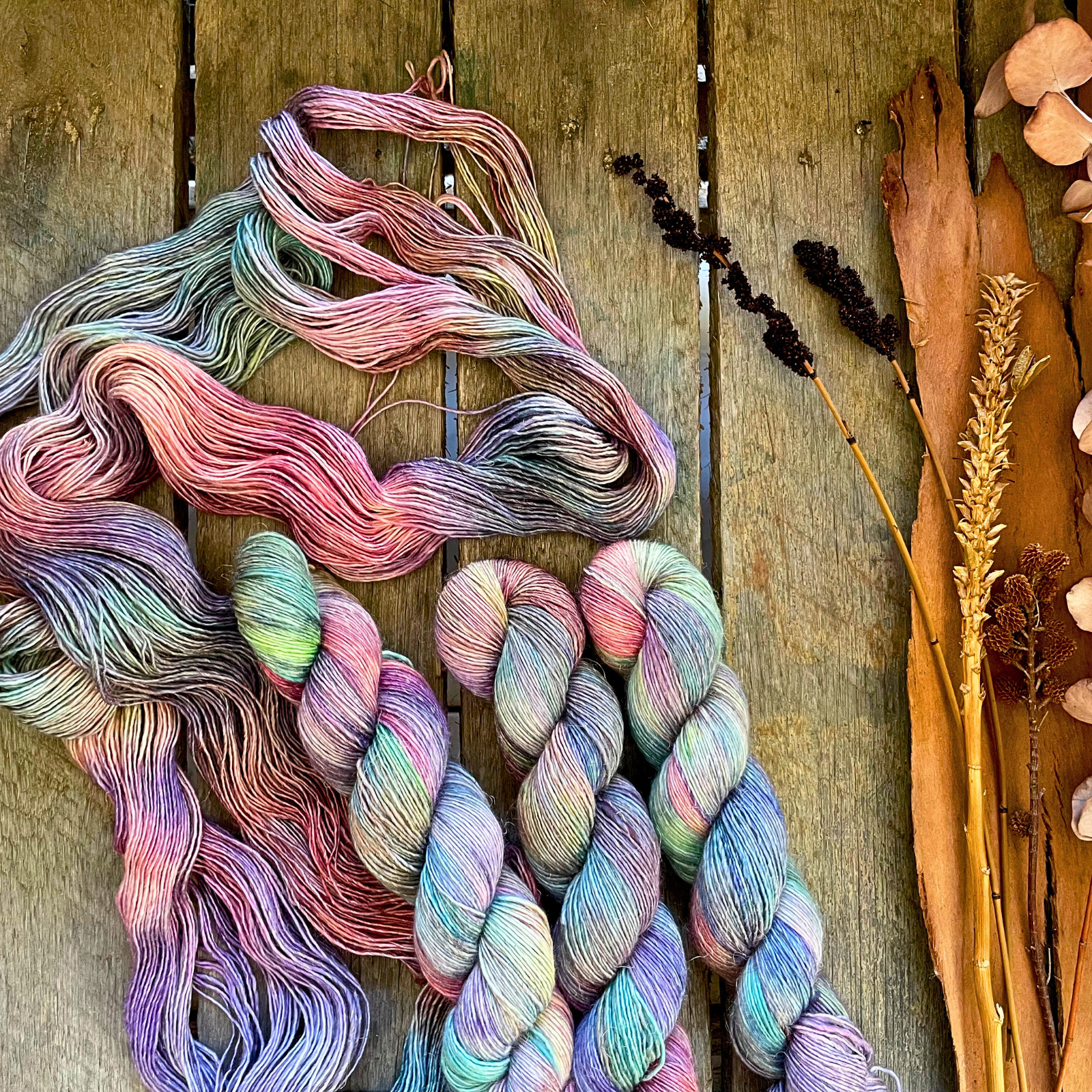 This colorway: “Bruised Fynbos” Muted violet folds into dusty fuchsia, lime flashes fade into earthy slate-blue — like crushed protea petals under a winter sky. Dyed in the skein, so the color lives in every twist.