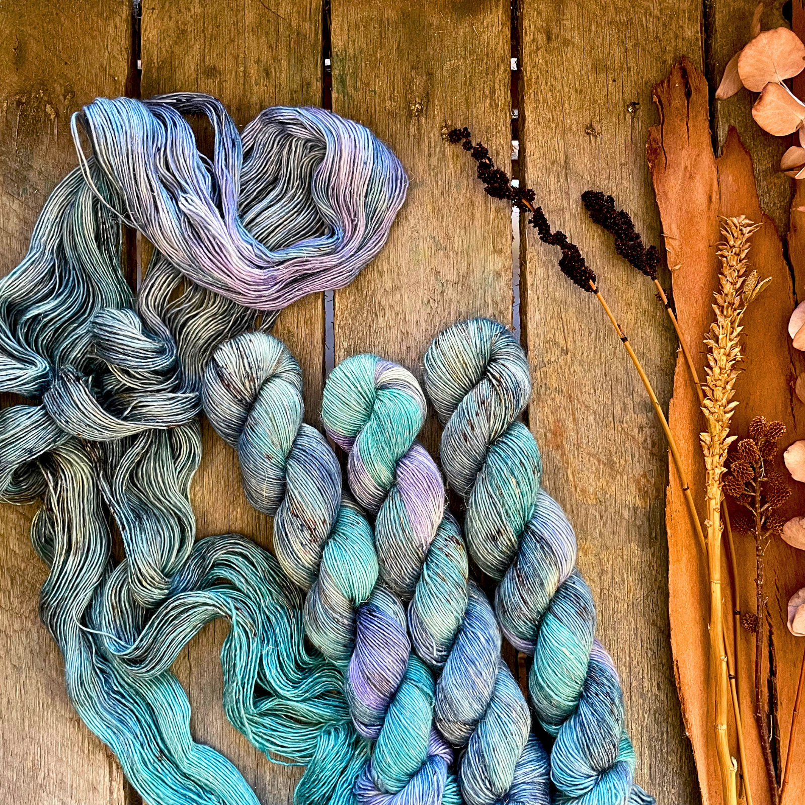 This colorway: “Mourning Rain” Soft turquoise drifts into storm-grey, then melts into muted violet — like tidal pools hidden beneath fynbos cliffs at dusk. Dyed in the skein, so the color lives in every twist.