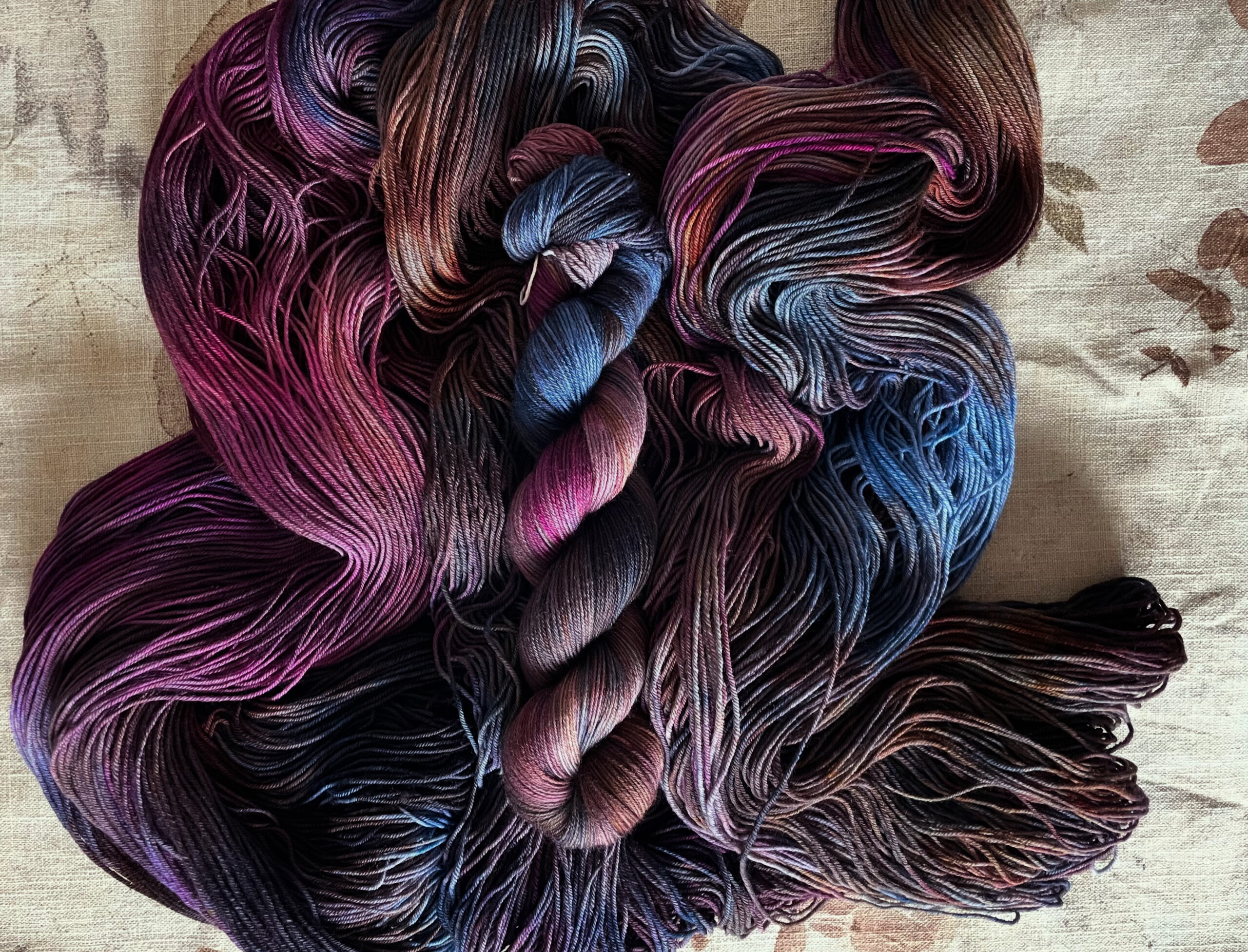 This colorway features shades moody browns, pinks, blues and vermillions and gentle corals, soft yellows and light blues.