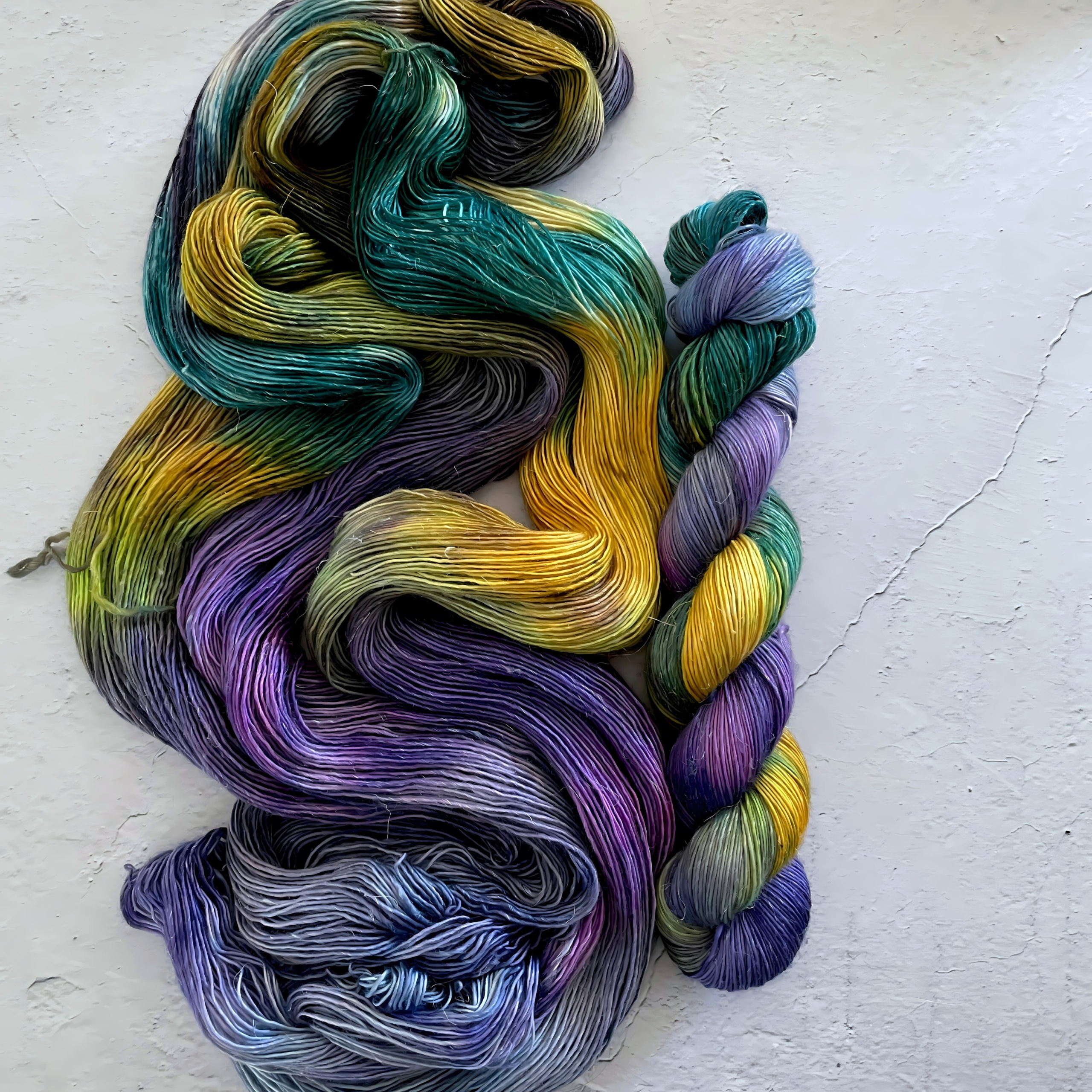 Watercolor Iris is a stunning colourway that blends deep purples, teals and yellows, reminiscent of the delicate brushstrokes of painted Iris flowers.
